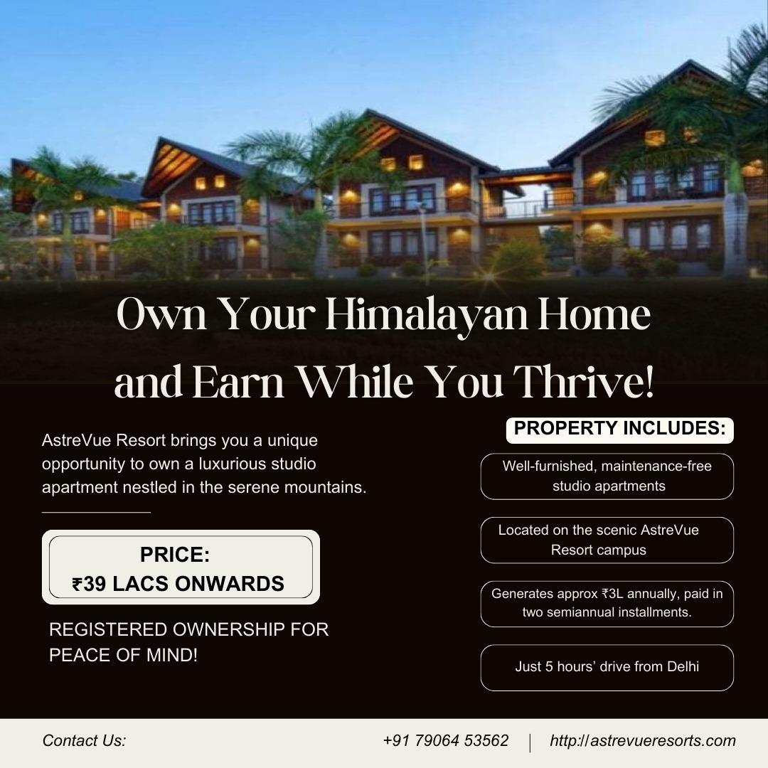 🌄 Own a Luxury Studio Apartment in the Serene Hills of Lansdowne! Uttarakhand ✅ Fully Furnished 500 SQFT Studio Apartment ✅ Just 5 Hours Drive from NCR ✅ Located Near the Popular Lansdowne Tourist Destination ✅ Enjoy Peaceful Living + Strong Investment Potential 💼 Smart Investment Opportunity 🔸 10% Assured Annual Interest on your investment. 🔸 50% Return in 5 Years 🔸 100% Refund of Investment in 10–11 Years 🔸 No Risk – High Reward